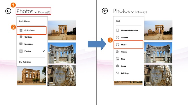 Once you open the music to playback, the music being selected will turn to background "now playing music". If you switch to other pages, the "now playing music" information will be shown in App bar on the browse page of Phone Information, Files, Music, Video, Apps, Call Logs, Contacts, Messages and Photos. Below image shows photo browse page as an example: